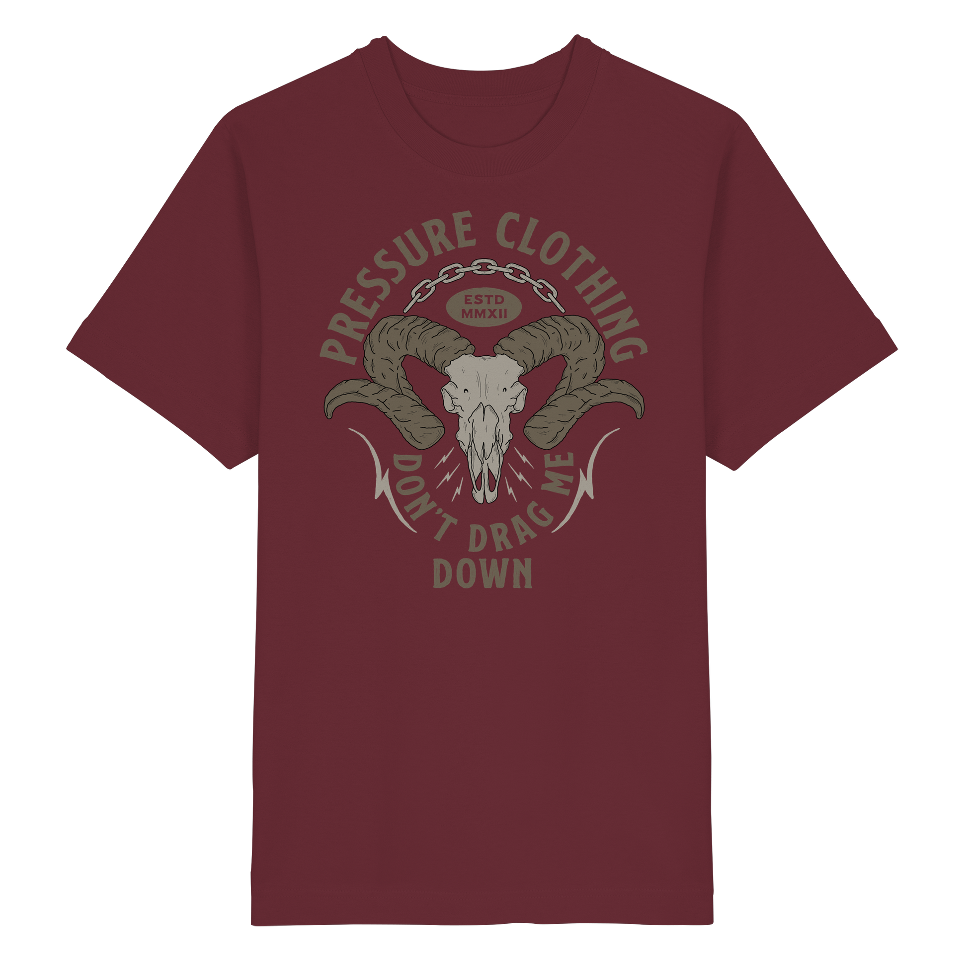 Das Design zeigt ein kraftvolles Widdermotiv, umrahmt von dem inspirierenden Slogan "Don't Drag Me Down" – ein Ausdruck von Stärke und Individualität.