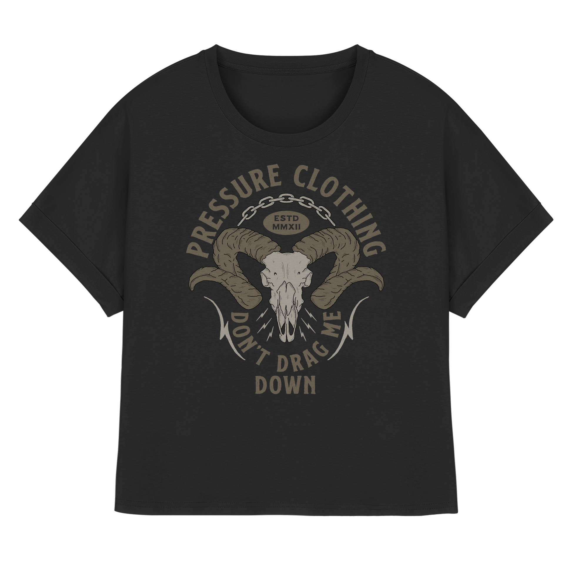 Erlebe den Reiz von Rebellion und Originalität mit unserem "Domba - Pressure Cloth - Womens Organic Rolled Sleeves T-Shirt". Mit einem markanten Design aus einem Widderkopf und dem Slogan "Don't Drag Me Down" setzt du ein Statement gegen den Alltag.