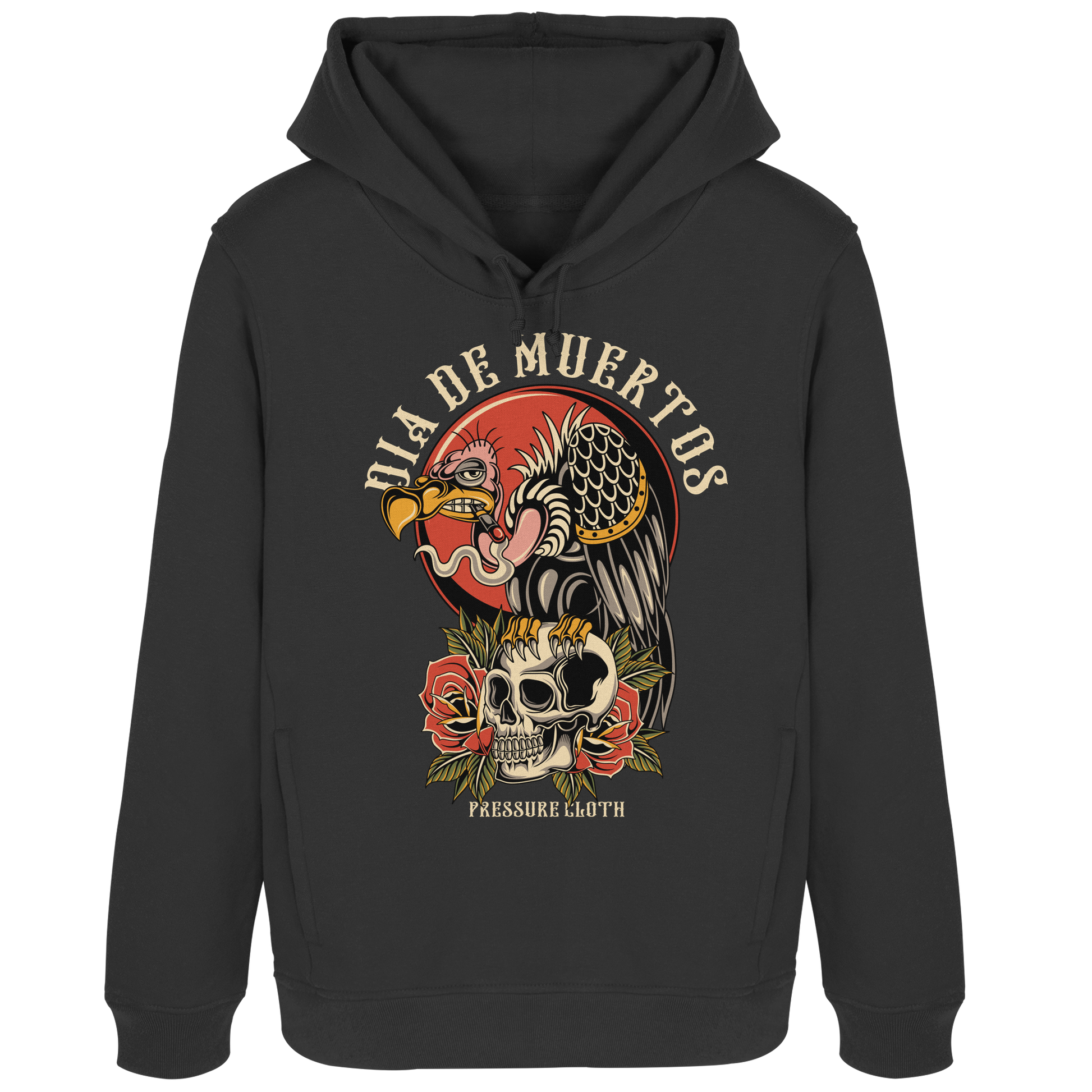 Unser Aasgeier-Design wurde mit viel Liebe zum Detail gestaltet und zeigt die bunte Vielfalt und das künstlerische Talent der mexikanischen Kultur. Das Motiv wurde im Vintage-Stil gestaltet und bringt den Geist von Rock'n'Roll und Rebellion zum Ausdruck.