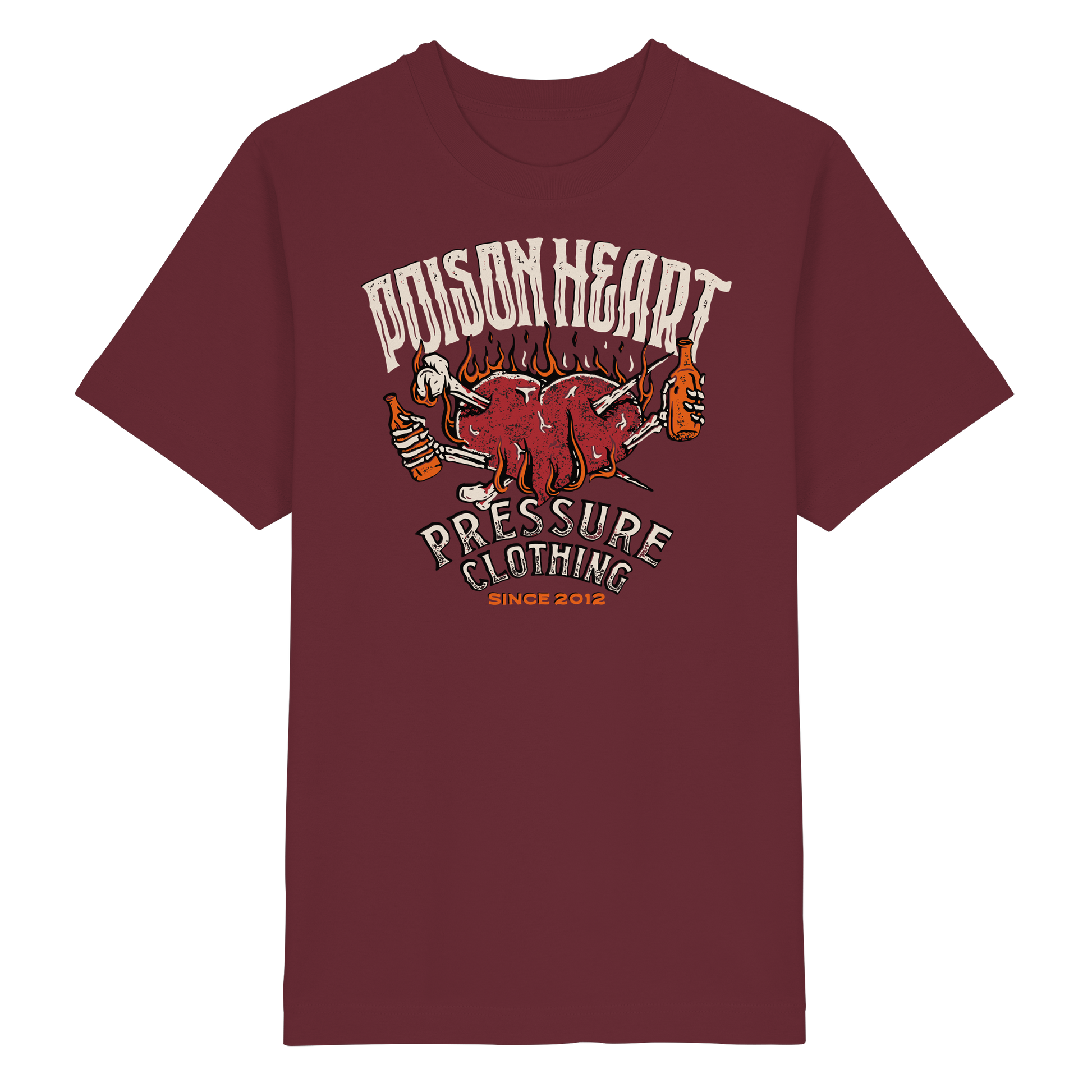 Das Shirt zeigt ein brennendes Herz-Motiv umgeben von Flammen und Knochen, das pure Leidenschaft und Unabhängigkeit symbolisiert. Die kräftigen Rot- und Orangetöne verleihen dem Design eine explosive Energie, während der Vintage-Stil an die goldenen Zeiten des Punkrocks erinnert.