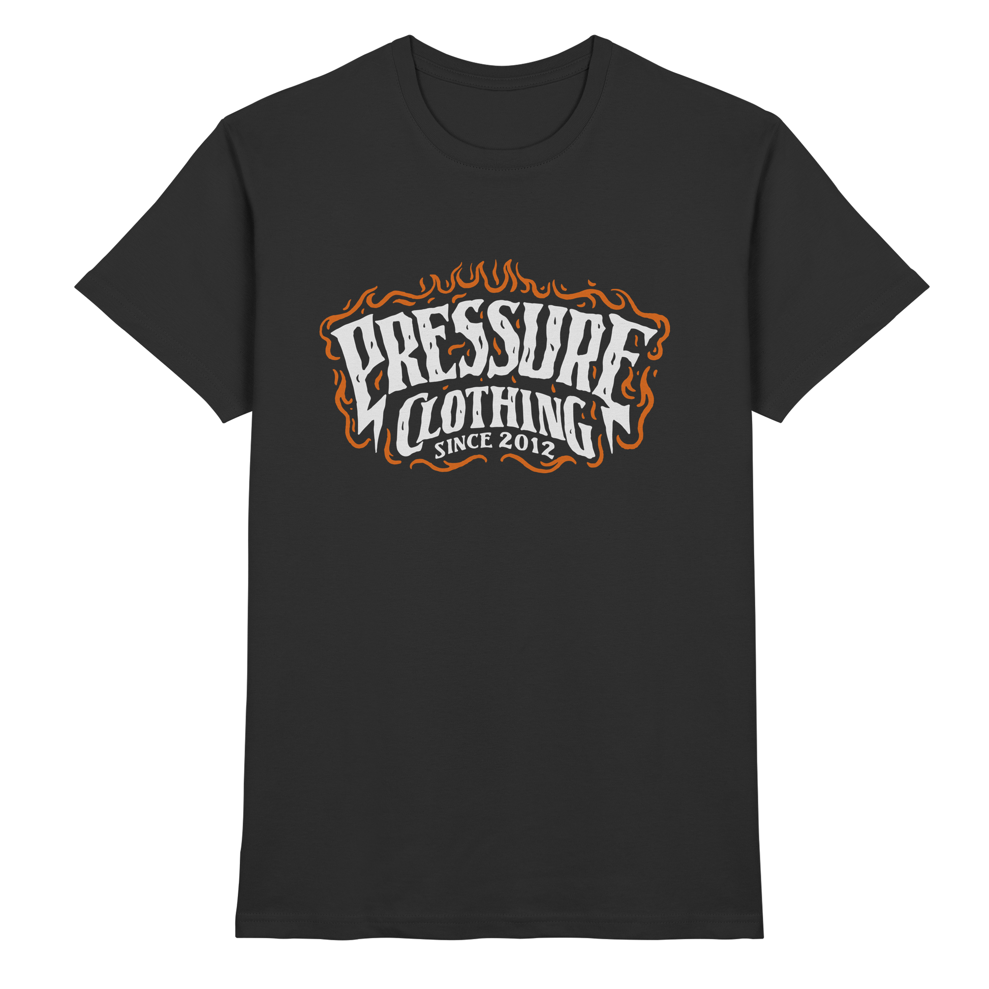 Das Shirt besticht durch seine auffälligen Flammenmotive und den markanten Schriftzug, der in kräftigen Farben gehalten ist. Die Kombination aus Schwarz und Orange sorgt für ein kraftvolles und dynamisches Erscheinungsbild.