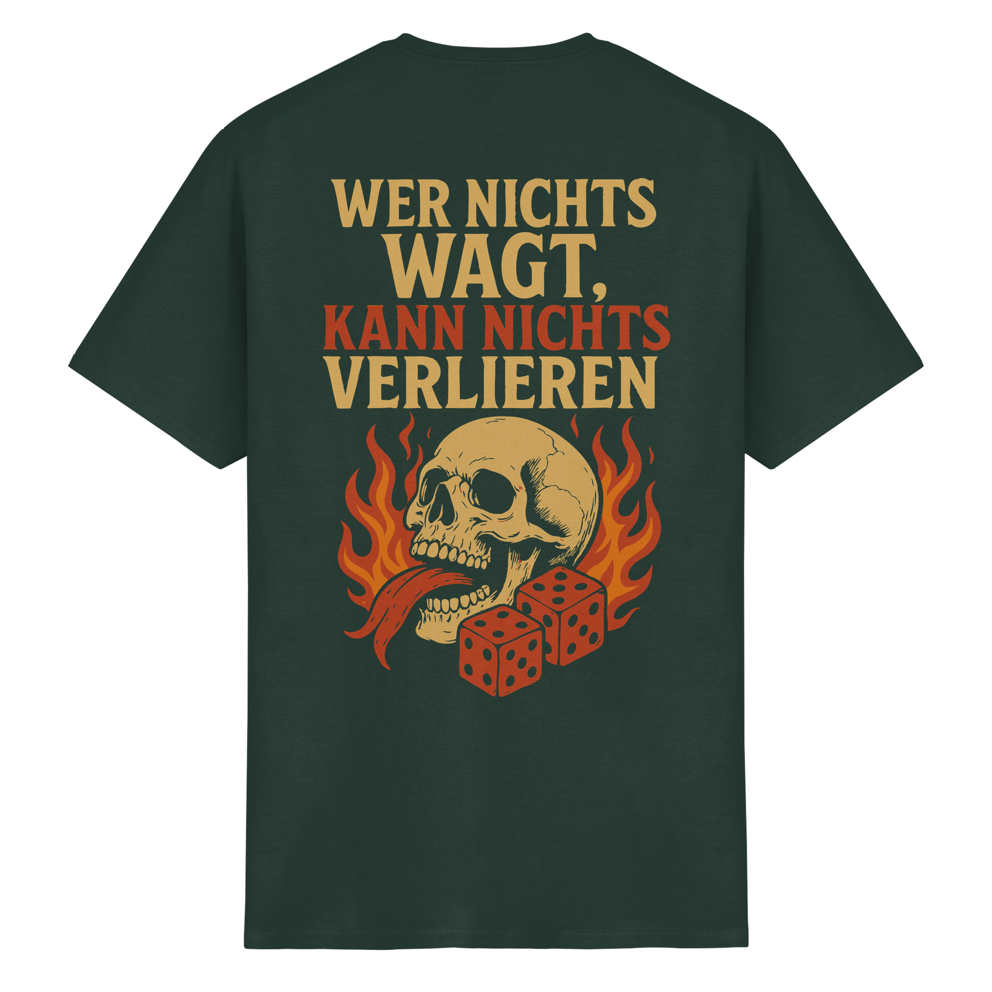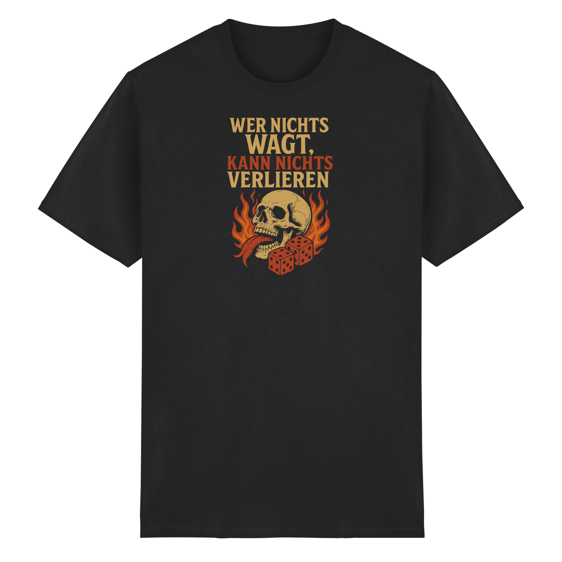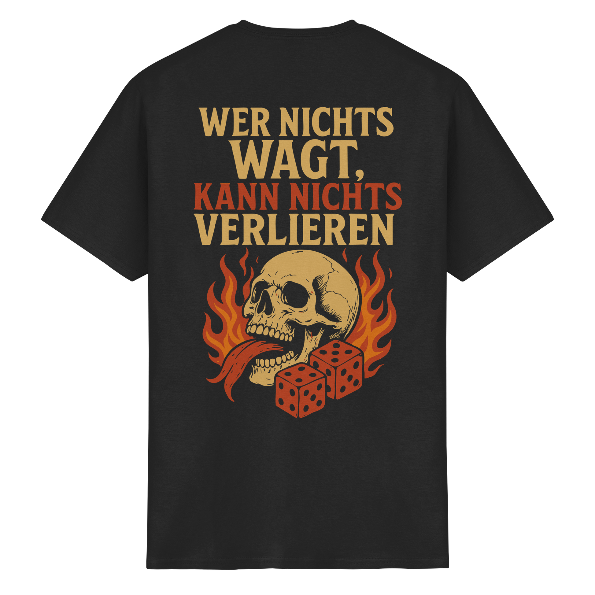 Dieses Shirt spricht Klartext: „Wer nichts wagt, kann nichts verlieren“ – ein gnadenlos ehrliches Statement für alle, die lieber selbst entscheiden, wann sie fallen. Das Design kombiniert brennende Flammen, einen Totenkopf mit ausgestreckter Zunge und Würfel – als Sinnbild für Risiko, Schicksal und den ewigen Tanz am Abgrund.